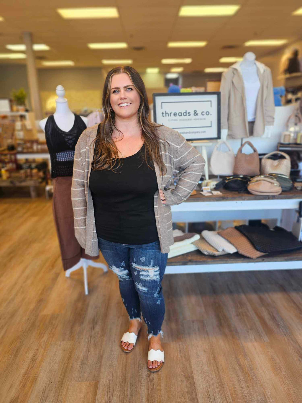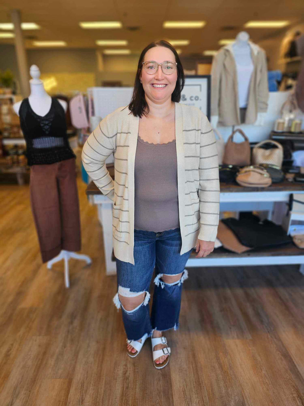 TAUPE STRIPED OPEN FRONT CARDIGAN